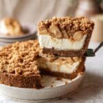 This Apple Crumble Cheesecake features a crunchy Lotus Biscoff cookie crust, a creamy spiced cheesecake layer, a fragrant apple topping, and a buttery crumble finish, creating a perfect blend of textures and flavors ideal for fall or any special occasion.