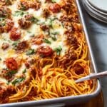 - Assemble the Bake: Preheat the oven to 375°F (190°C). Lightly grease a 9×13 inch baking dish. Transfer half of the spaghetti and sauce mixture into the dish. Sprinkle half of the mozzarella and Parmesan cheeses over the layer.