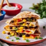 For a party, I like cutting the quesadilla into small wedges and arranging them on a colorful platter with bowls of salsa, guacamole, and sour cream around for dipping. It’s fun, festive, and perfect for sharing with friends or family.