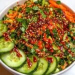 - Combine and Serve: Add the crispy chili rice to the salad base and drizzle the peanut-chili dressing over the top. Toss carefully to coat everything evenly and garnish with crushed peanuts and optional chili flakes for extra heat. Serve immediately to enjoy the contrasting textures of crispy rice and fresh vegetables.