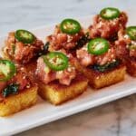Personally, I’m all about bright colors and fresh textures, so I love topping these bites with thinly sliced avocado for creaminess and jalapeño for a nice spicy snap. Toasted white sesame seeds add a nutty crunch, and a drizzle of sweet chili sauce ties everything together with a subtle sweetness. Don’t skip the green onion, either—it adds just the right fresh punch on top.