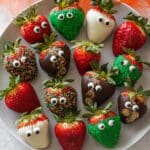- Create Ghost Strawberries: After dipping in white chocolate, place two candy eyeballs on each strawberry to create eyes. Use chocolate chips to add a mouth or other ghostly features if desired. Let set until firm.