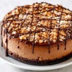 This German Chocolate Cheesecake is a decadent dessert featuring a chocolate graham cracker crust, rich and creamy cheesecake filling infused with German chocolate, and topped with a luscious coconut pecan topping. The cheesecake is cooked in a roasting pan using a water bath technique, ensuring a smooth and creamy texture, with an optional chocolate drizzle to finish.