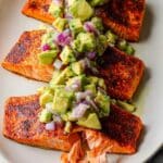 Once your salmon is off the grill, plate it immediately with a generous scoop of avocado salsa on top or on the side. The contrast of warm, spicy salmon with cool, creamy salsa is absolutely delicious. Don’t be shy with leftover salsa — it’s fantastic on toast or eggs the next day.