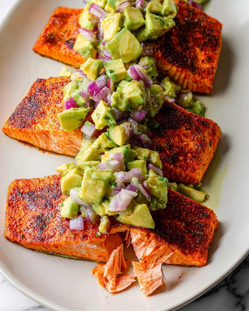 For special occasions, I like to serve the salmon on a large platter with the avocado salsa spooned in rows or dollops, garnished with edible flowers or microgreens. You can also serve individual salmon fillets in shallow bowls topped with salsa and a drizzle of chili oil for an elegant finish that impresses guests without extra fuss.