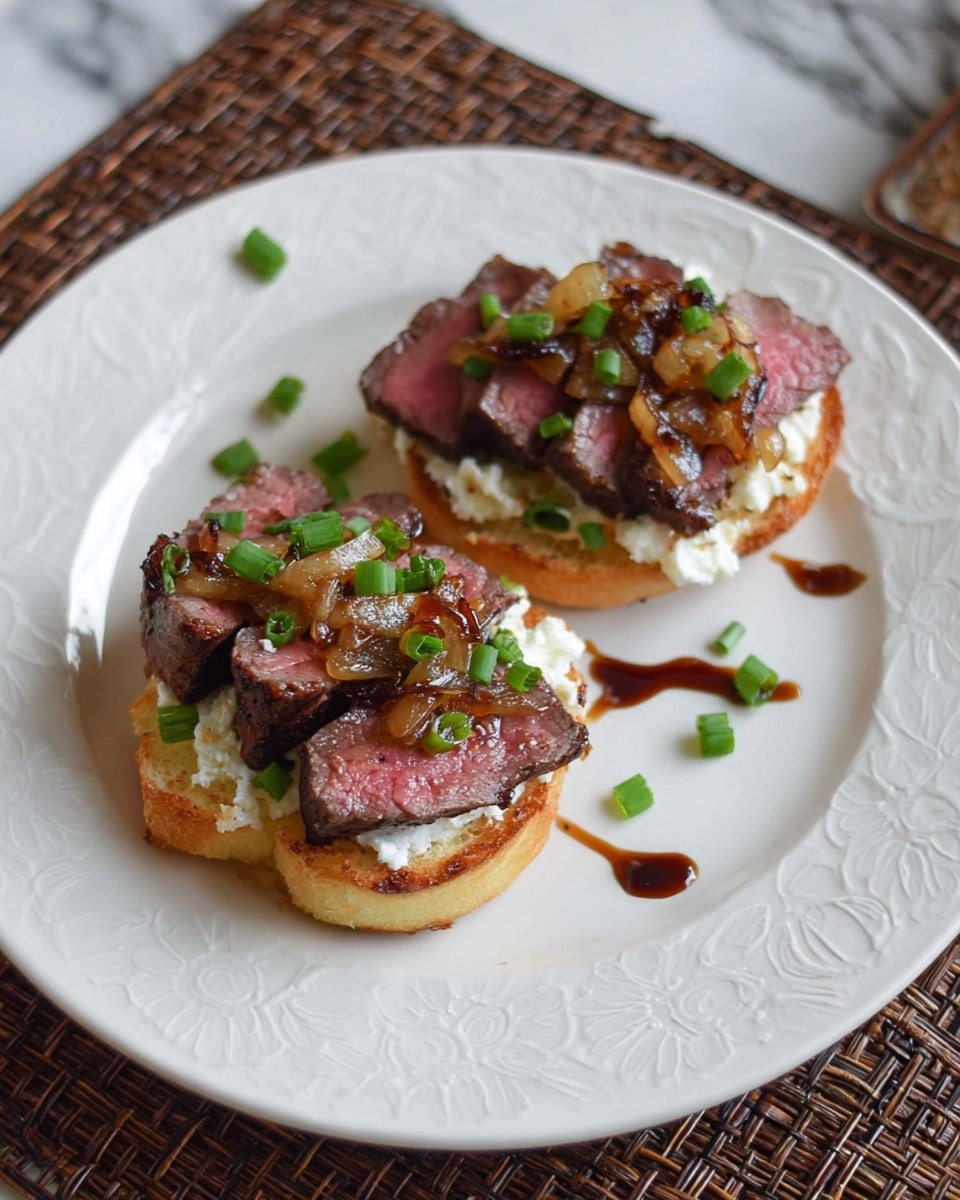 • Variation: Add a layer of blue cheese or goat cheese on the crostini before topping with steak for a richer bite.