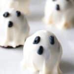 These Halloween Oreo Truffle Ghosts are a spooky and delicious treat perfect for Halloween parties. Made with crushed Oreo cookies and cream cheese, coated in white candy melts, and decorated with black writing gel or candy eyes to create adorable ghost shapes.