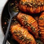 I once made these Hasselback Sweet Potatoes with Garlic, Sage, and Nutmeg Recipe for a holiday dinner and arranged individual potatoes in mini cast iron skillets to serve. It looks charming and keeps them warm on the table. You could also slice the potatoes fully after baking and fan them out on a serving plate, drizzling a little extra butter or olive oil for shine.