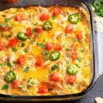 Pop the casserole into your preheated oven and bake for about 30 minutes until the cheese is bubbly and slightly golden. Once it’s out and resting, sprinkle the diced tomato and chopped cilantro on top to add a fresh burst of flavor and color. If you’re using jalapeños, add them now or pass them as a garnish so everyone can control their heat levels.