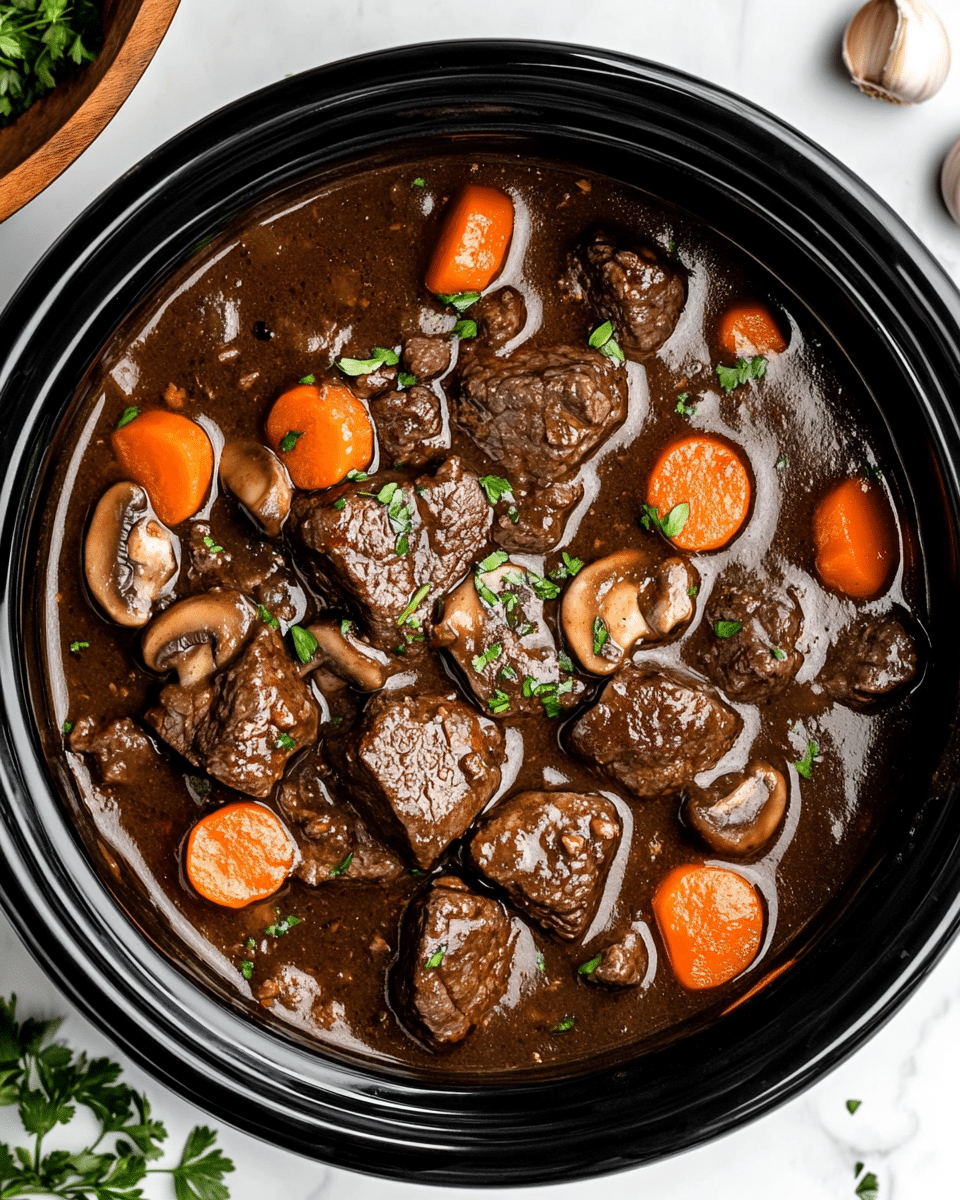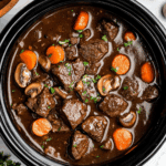 This Slow Cooker Beef Bourguignon is a rich and flavorful French classic made easy with tender beef chuck slowly simmered in red wine, beef broth, and aromatic vegetables. Perfect for a comforting dinner, this recipe infuses deep flavors into every bite, enhanced by garlic, thyme, and mushrooms, then garnished with fresh parsley for a vibrant finish.