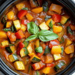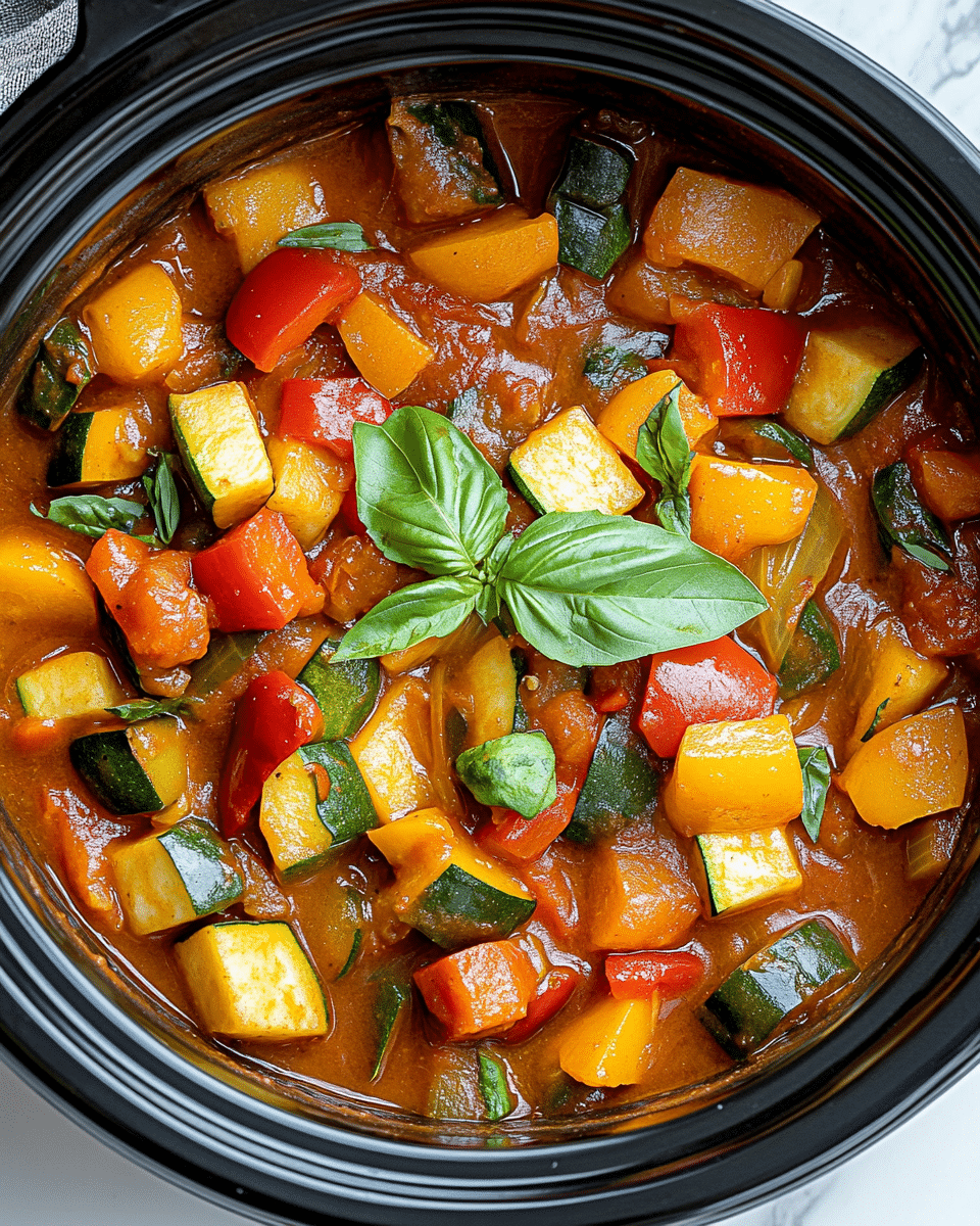 This Slow Cooker Ratatouille recipe is a flavorful and hearty vegetable stew that brings together tender eggplant, zucchini, bell pepper, and tomatoes simmered with fragrant herbs and garlic. Prepared effortlessly in a slow cooker, it’s a perfect no-fuss dinner that allows the vegetables to meld into a rich, savory dish that can be enjoyed as a main or side.