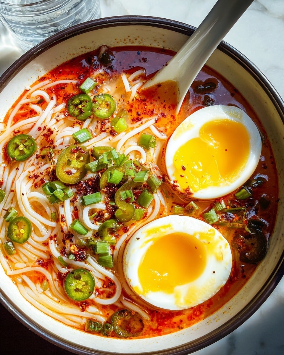 - Soft boiled eggs add a creamy texture that balances the soup’s spiciness.