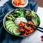 This Spicy Pork Bulgogi Rice Bowl Recipe freezes surprisingly well! After cooking and cooling, I portion out the pork (without rice or fresh garnishes) into freezer-safe bags. It keeps for about 2 months, making it a great make-ahead meal if you want to prep in advance.