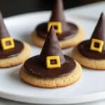 Witches’ Hats are a fun and festive Halloween treat featuring fudge stripe cookies topped with a milk chocolate candy kiss and decorated with honey and gel to look like whimsical witch hats. These no-bake delights are quick to assemble, making them perfect for holiday parties or themed gatherings.
